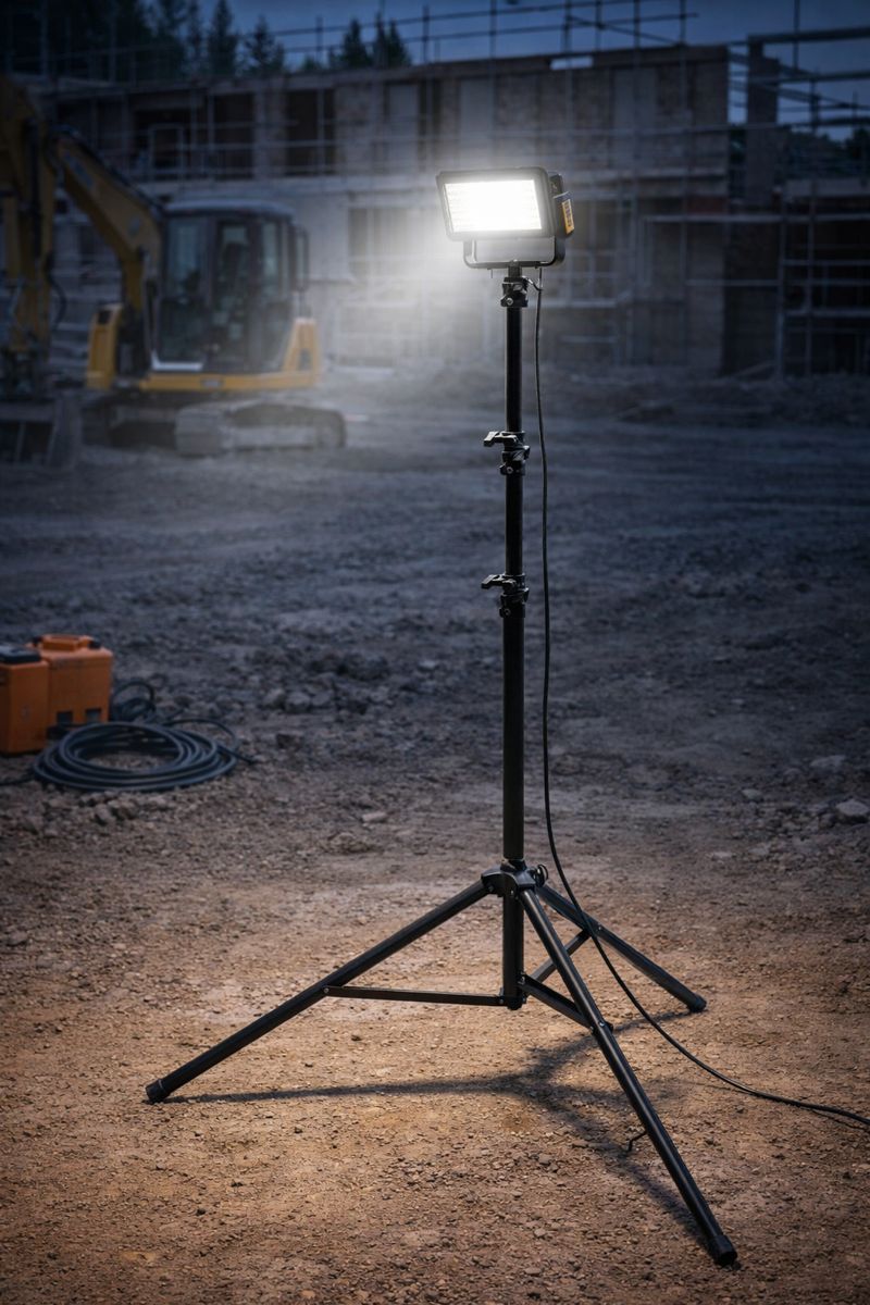 A stabil, acél teleszkópos állvány építkezési reflektorokhoz készült, és 1,24 m-től egészen 3 m-ig fokozatmentesen állítható, így könnyen beállítható az ideális megvilágítási magasság. Nagy előnye az automatikus süllyesztő mechanizmus, amely a rögzítőcsavarok oldásakor kontrolláltan, lassan engedi le a csövet – így biztonságosabb a használat. Az állvány akár 20 kg teherbírású, beépített kábelakasztóval rendelkezik a botlásveszély csökkentésére, és rugalmas rögzítést kínál: T-rúd 1 reflektorhoz, illetve keresztkar 2 reflektor felszereléséhez. A stabilitásról 3 masszív, összecsukható láb gumivédővel gondoskodik