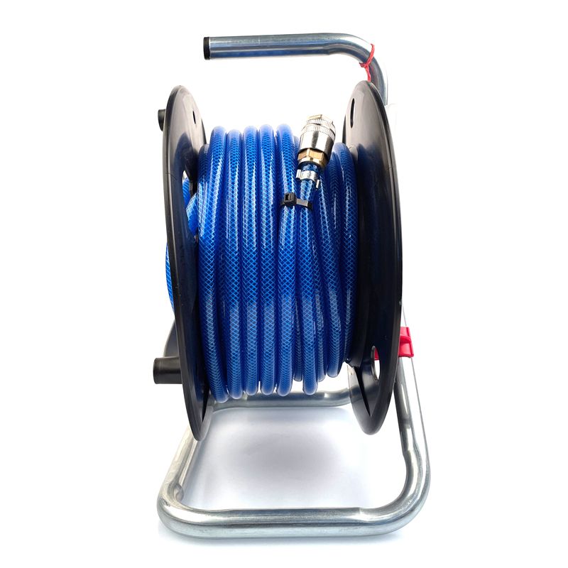 Sűrített levegős tömlődob prémium minőségű textiltömlővel, ideális műhelybe, garázsba vagy pincébe. Ez a praktikus tömlődob 20 m hosszú tömlővel rendelkezik (18,5 m tömlő + 1,5 m csatlakozó) és 15 bar üzemi nyomásra lett tervezve. A kényelmes csatlakoztatást fém, egykezes gyorscsatlakozók biztosítják.