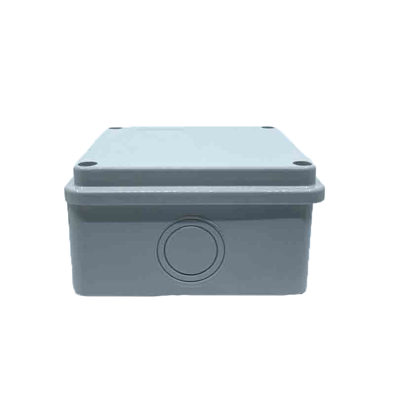 Szerelődoboz elektromos berendezésekhez, szürke, átlátszatlan fedéllel.