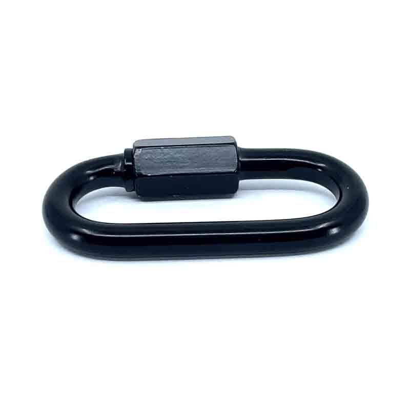 A fekete anyával ellátott karabiner alkalmas láncszemek csatlakoztatására és könnyű terhek felakasztására.
