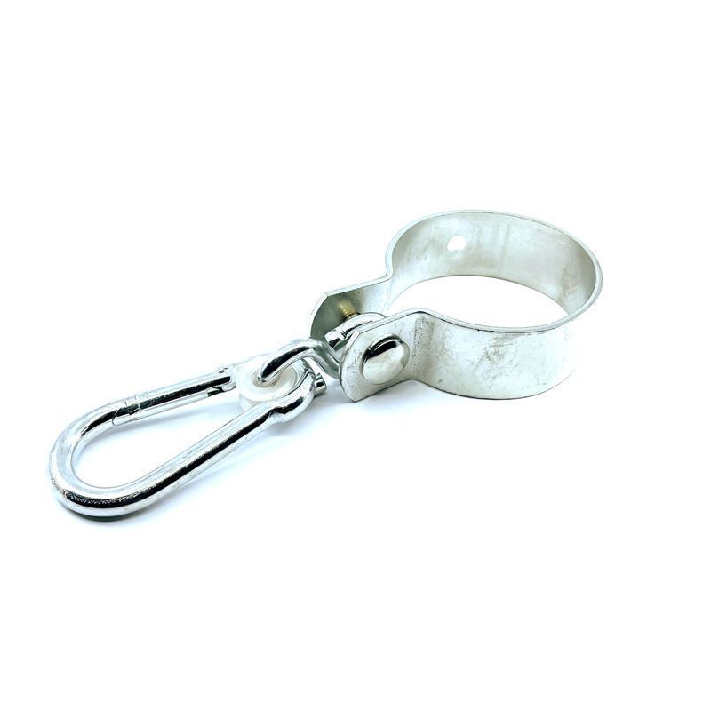 Hinta tartó bilincs karabinerrel, galvanikus cink-kromát (fehér) felületkezeléssel. Ezt a bilincset a fagerendák leggyakoribb átmérőjére tervezték, leggyakrabban rönkökhöz.