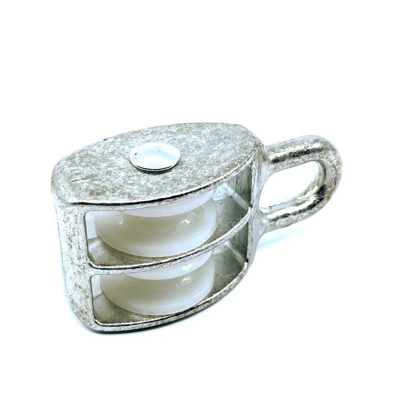 Dupla csiga, szilárd, nylon kerekekkel, horganyzott. Az acél csiga szemmel és két tekerccsel rendelkezik. A tekercsek nylonból készülnek.