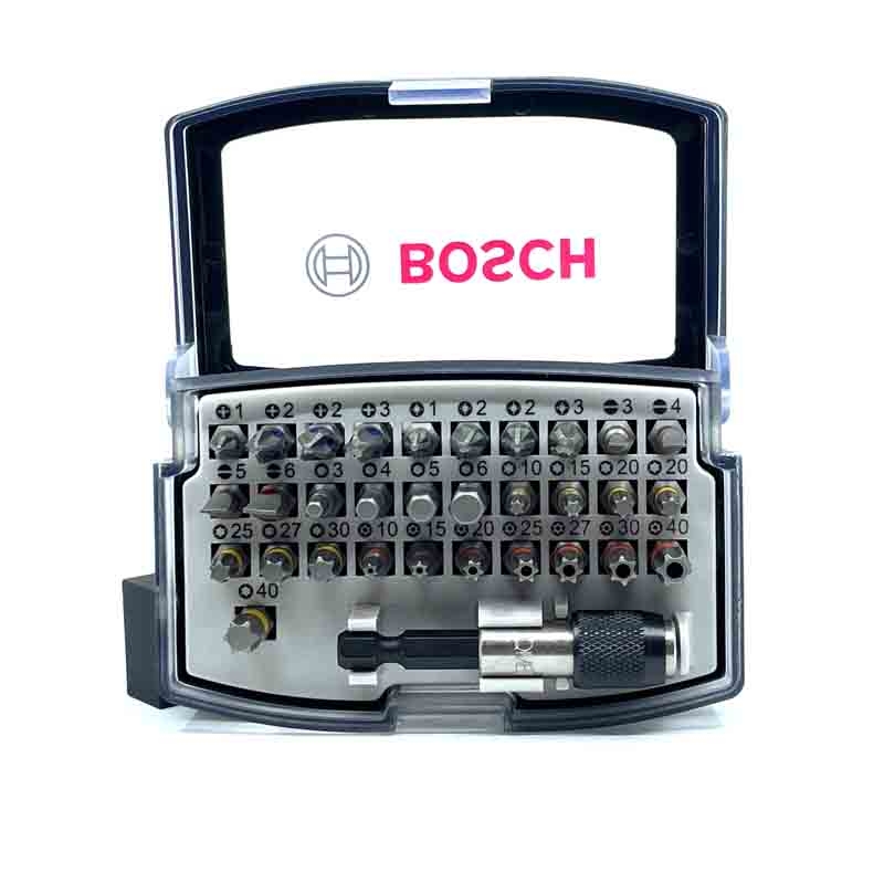 - Különféle csavarhúzó biteket tartalmazó készlet, átlátszó tetővel ellátott kis kofferben.