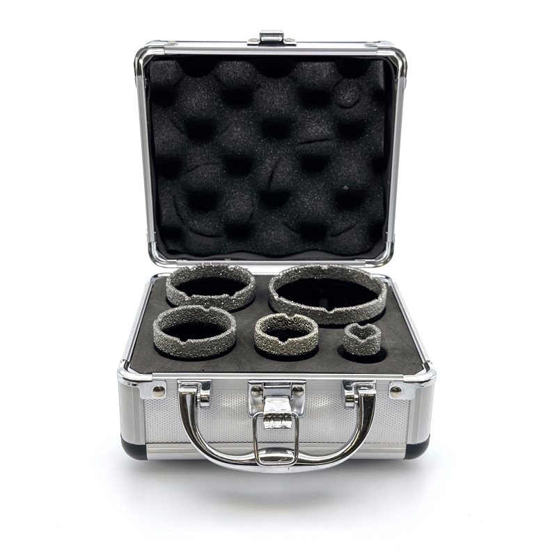 Gyémánt fúrószárak maró készlete praktikus kofferben. Ezek a fúrószárak garantálják a legkeményebb anyagok fúrásának gyorsaságát.