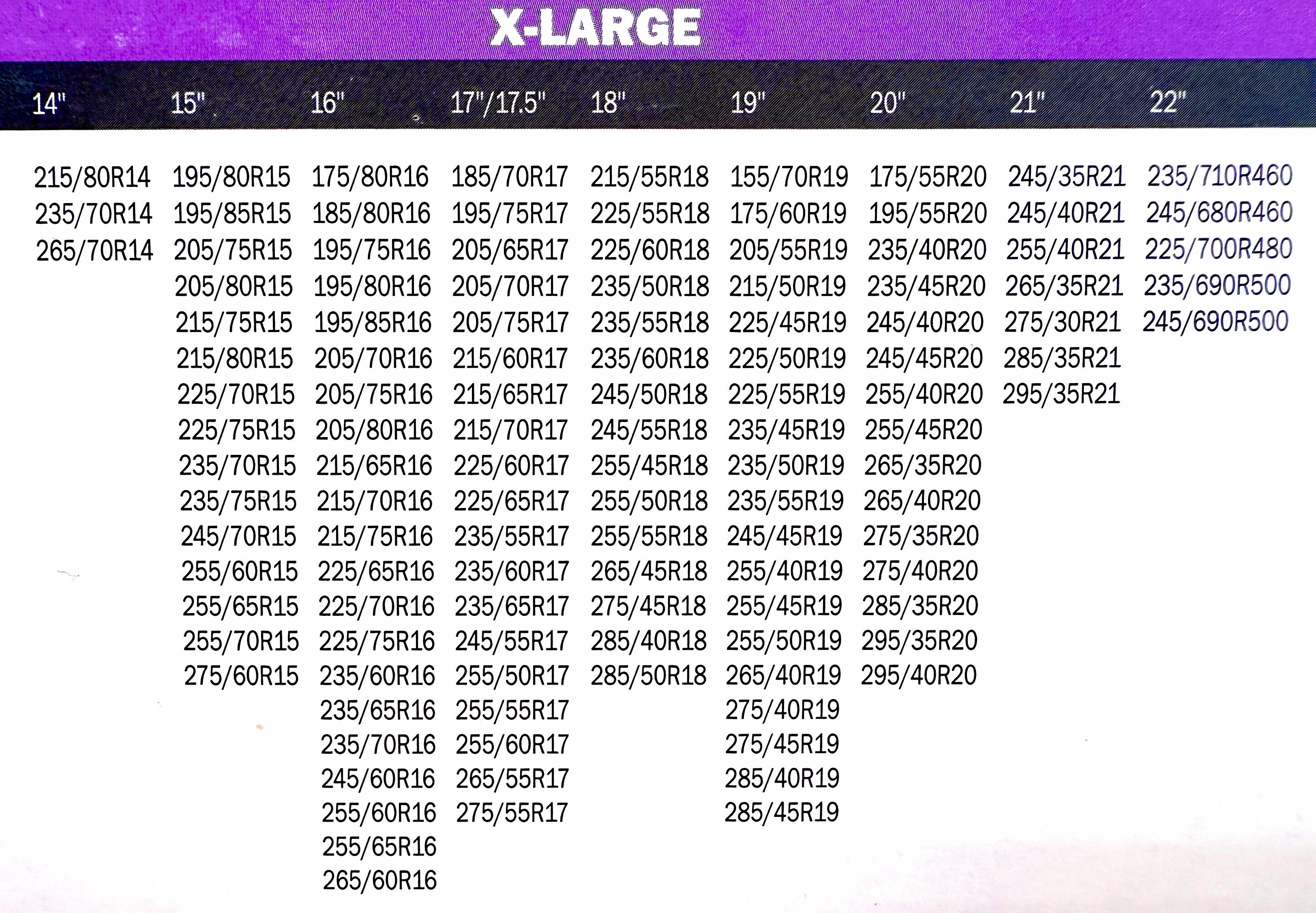 - A megfelelő méret kiválasztásához használja a gumiabroncs-méret szerinti alkalmazási táblázatot (XS–XXLméretek).