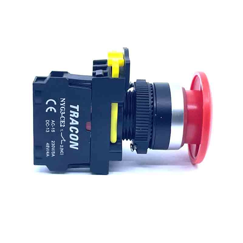 Vészgomb reteszelő piros rezgésálló, érintkezőkkel 1xNC (nyitott), 230V névleges feszültséggel és 5A névleges árammal.