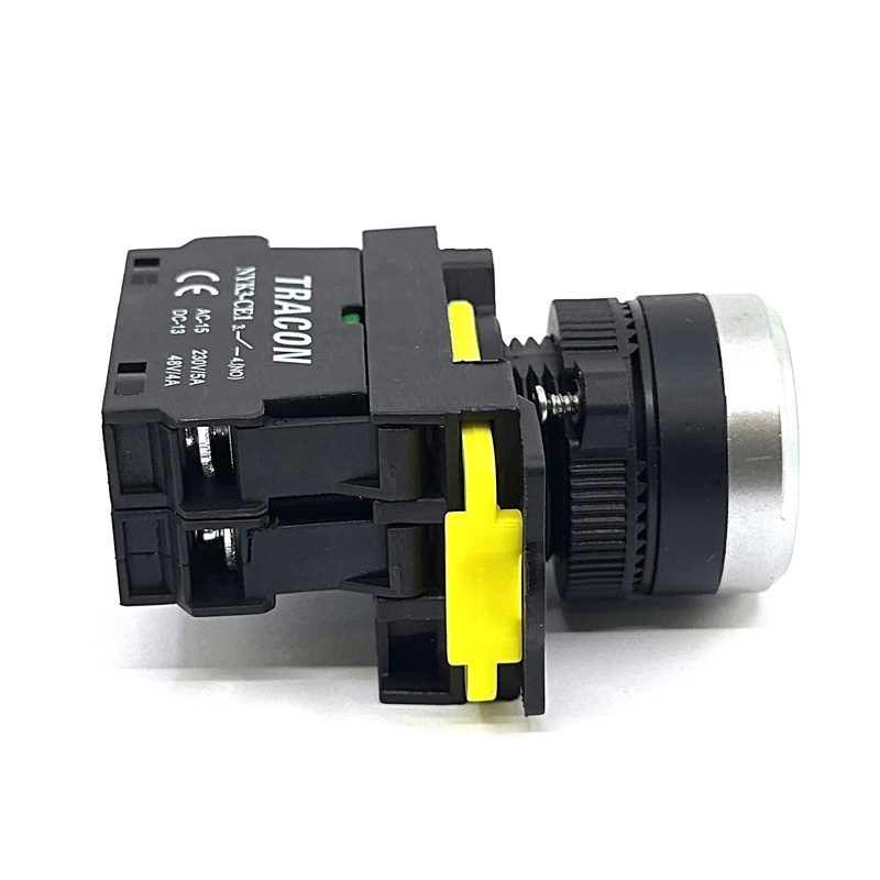 Rezgésálló, háttérvilágítással ellátott nyomógombos kapcsoló 1xNO (kapcsoló) érintkezőkkel, 230V névleges feszültséggel és 5A névleges áramerősséggel.