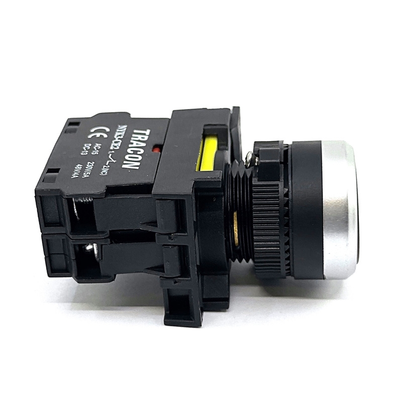 Rezgésálló, háttérvilágítással ellátott nyomógombos kapcsoló 1xNO (kapcsoló) érintkezőkkel, 230V névleges feszültséggel és 5A névleges áramerősséggel.