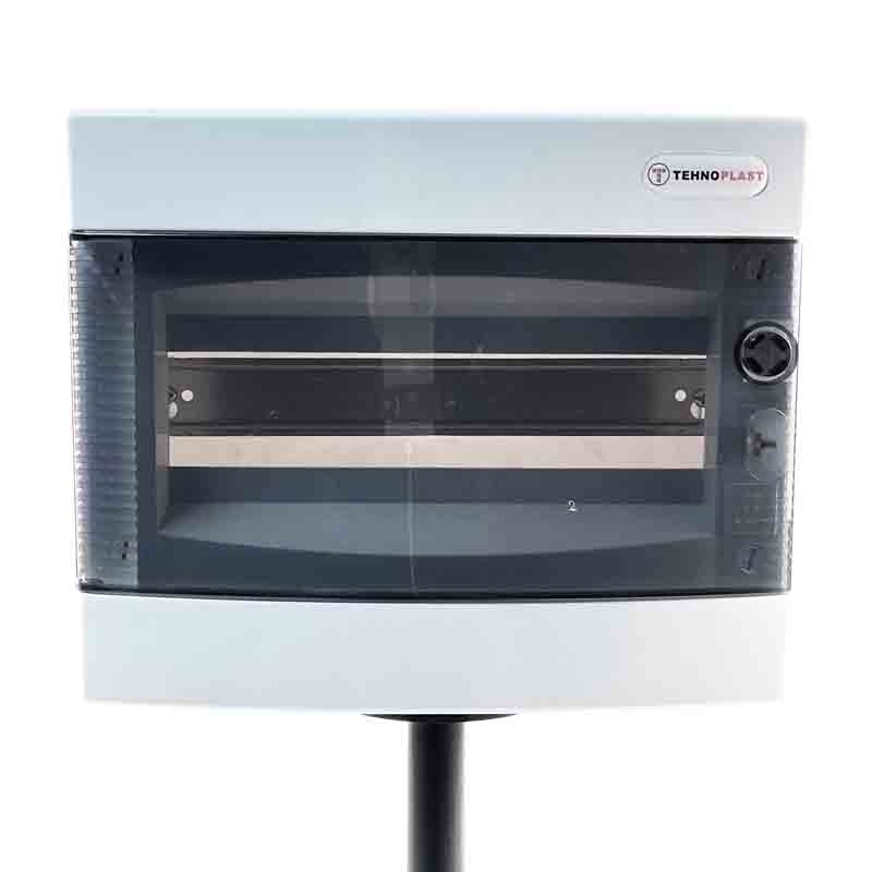 Fehér elosztódoboz vakolat fölé, átlátszó ajtóval, 12 modulos.